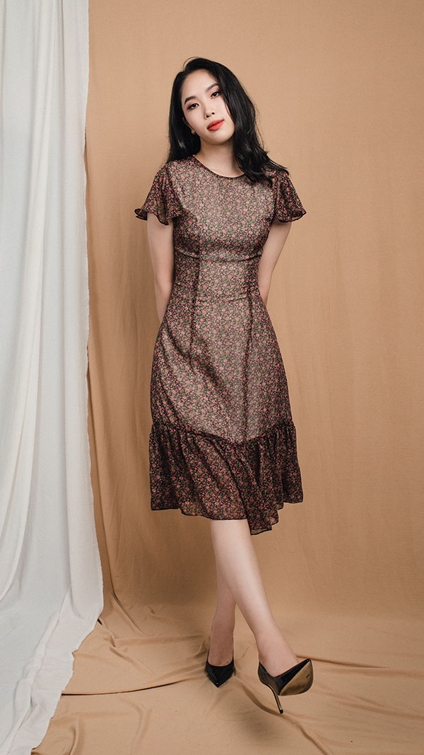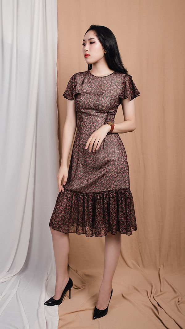 Đầm voan đen hoa nhí đỏ đô , chất vải voan thoáng mát được may hai lớp tỉ mỉ , phần tay cánh tiên nhẹ nhàng